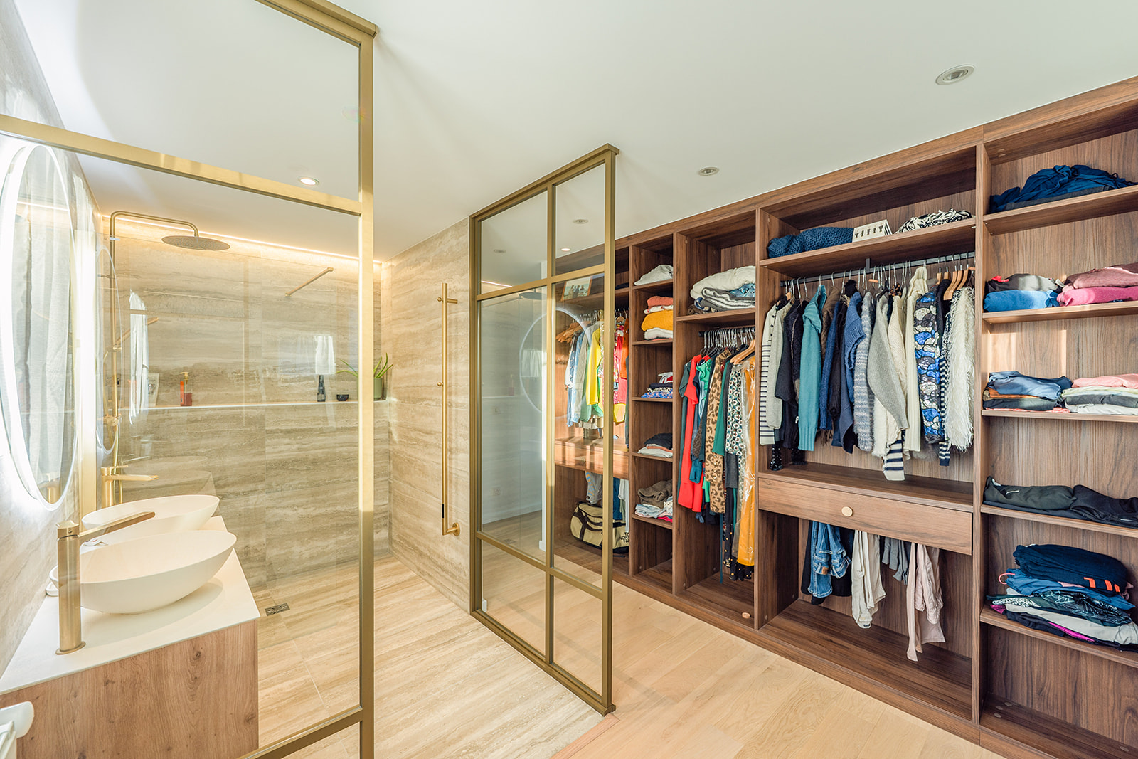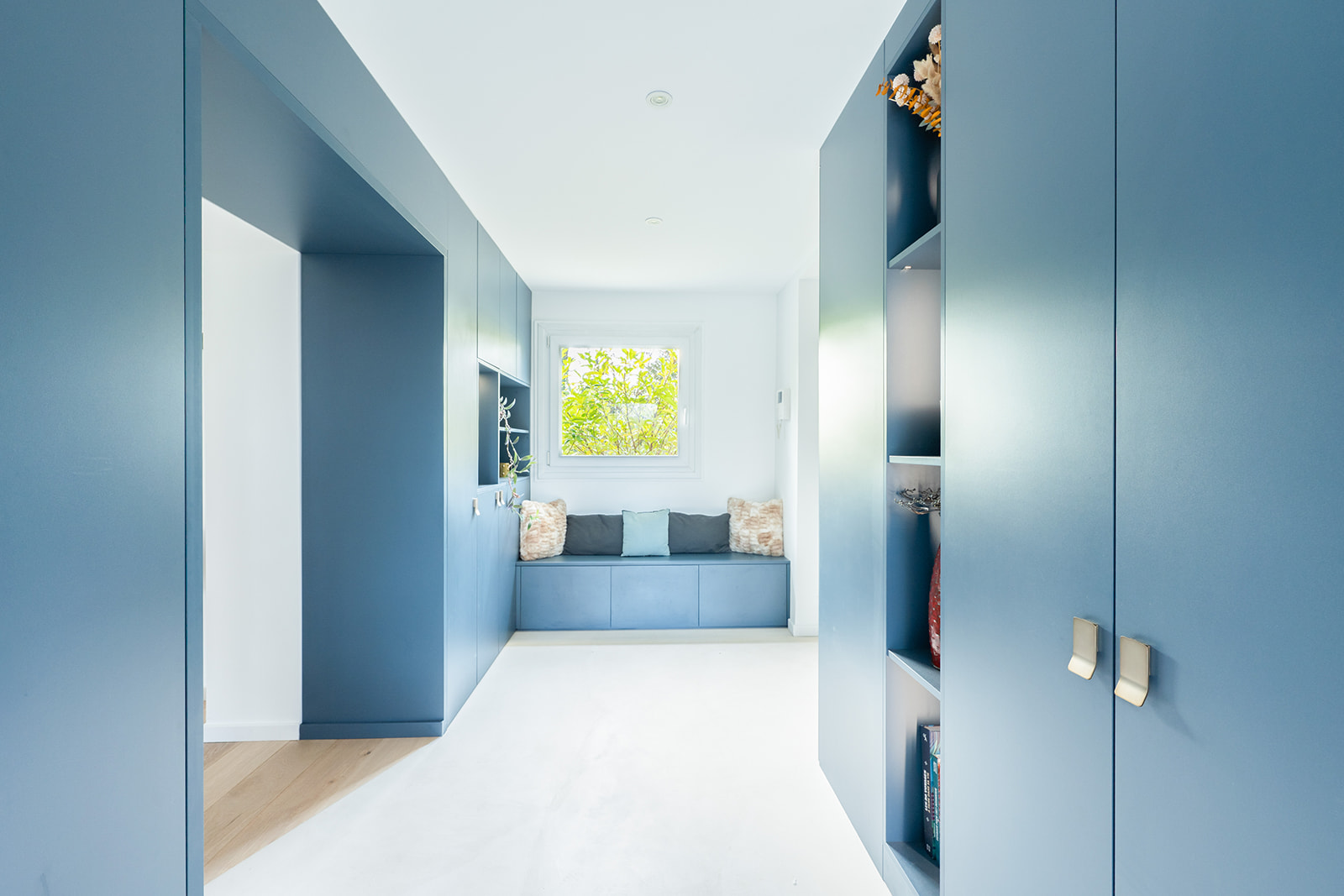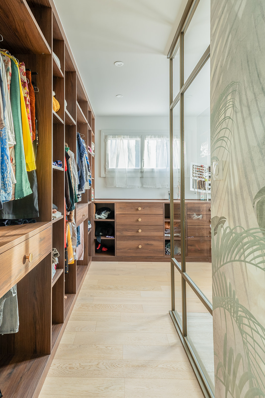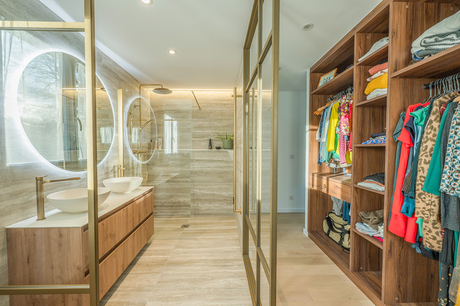 À l’étage, la création d’une suite parentale sur-mesure a marqué une étape clé de la rénovation. En fusionnant deux chambres, nous avons conçu un espace dédié au bien-être, intégrant un coin dressing optimisé et une salle de douche moderne. Chaque détail a été pensé pour offrir confort, intimité et élégance, dans une ambiance apaisante et fonctionnelle.